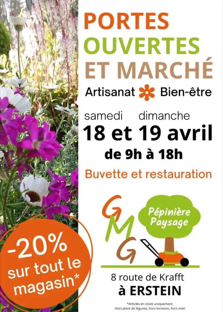Samedi et dimanche 18 & 19 avril, je serai présente de 9H à 18H aux portes ouvertes de la pépinière GMG à Erstein pour le marché de l’Artisanat et du Bien-être.